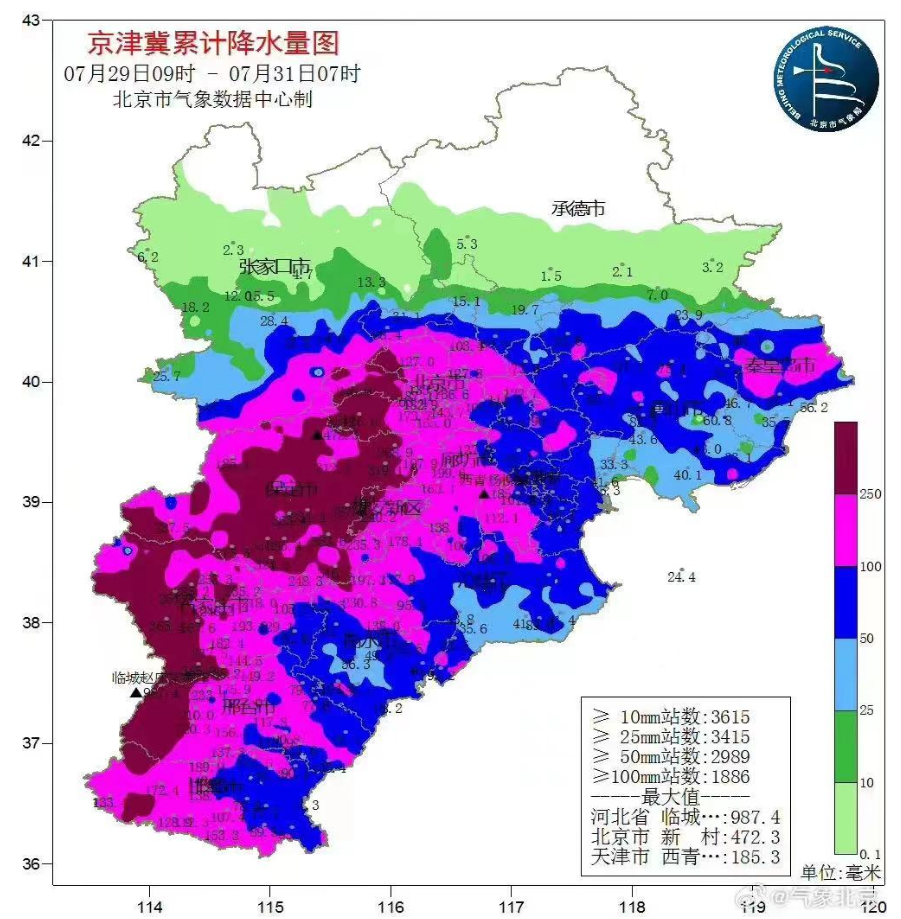 中央气象台表示,7月29日以来,河北中南部和东部、北京大部、天津、山西中东部、河南大部、山东中西部及半岛北部等地出现了大到暴雨;北京中南部、河北中南部和东北部、河南北部、山西东部、山东西部等地部分地区大暴雨;河北中南部、北京西南部、河南北部等地部分地区特大暴雨,过程累计降雨量250至998.1毫米,大部地区最大小时雨强20至50毫米,局地超过80毫米。