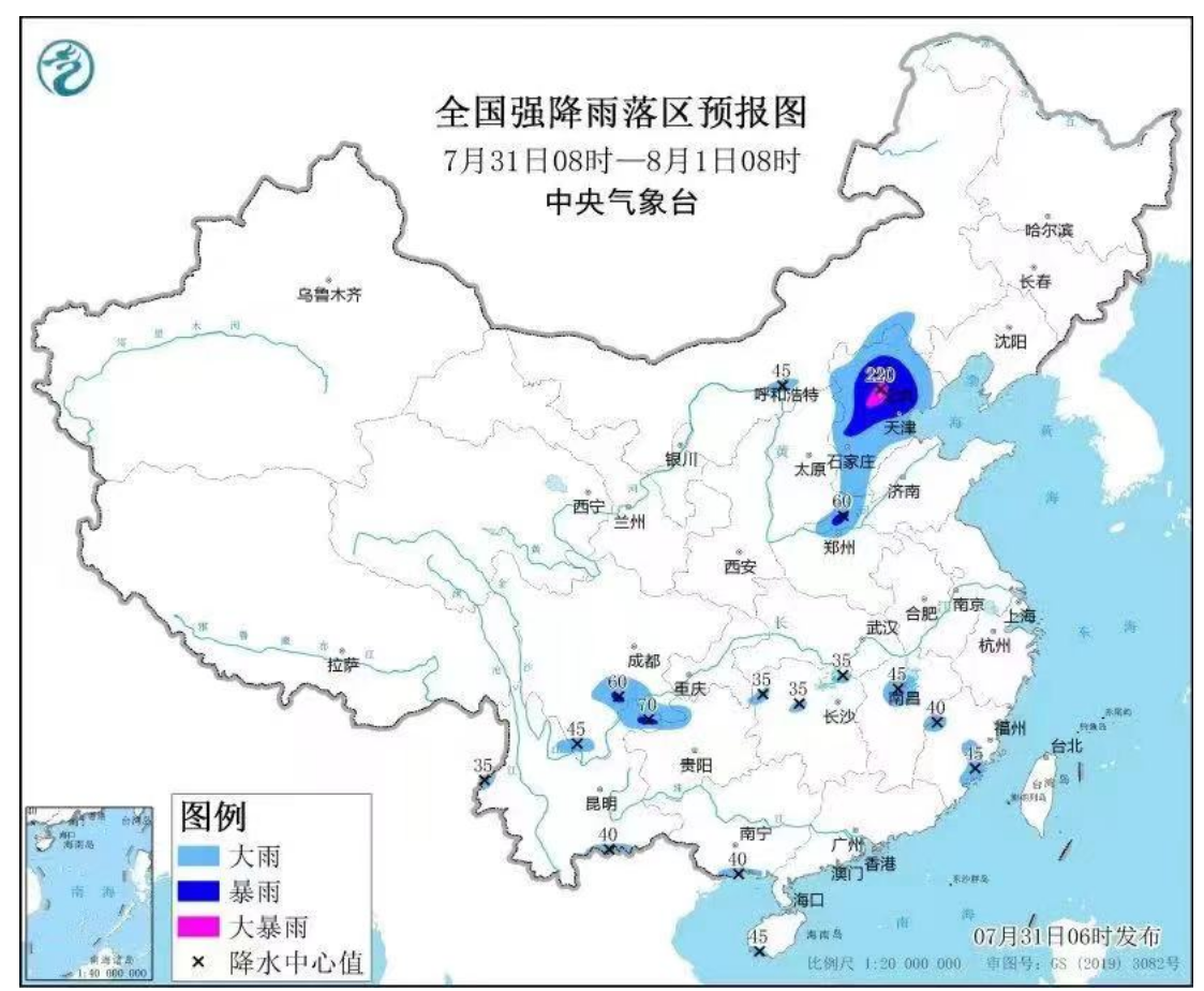中央气象台今晨继续发布暴雨红色预警、强对流天气黄色预警。预计,7月31日8时至8月1日8时,河北大部、北京、天津、山西东部等地有大到暴雨,其中,河北中部、北京中西部等地的部分地区有大暴雨(100至220毫米)。