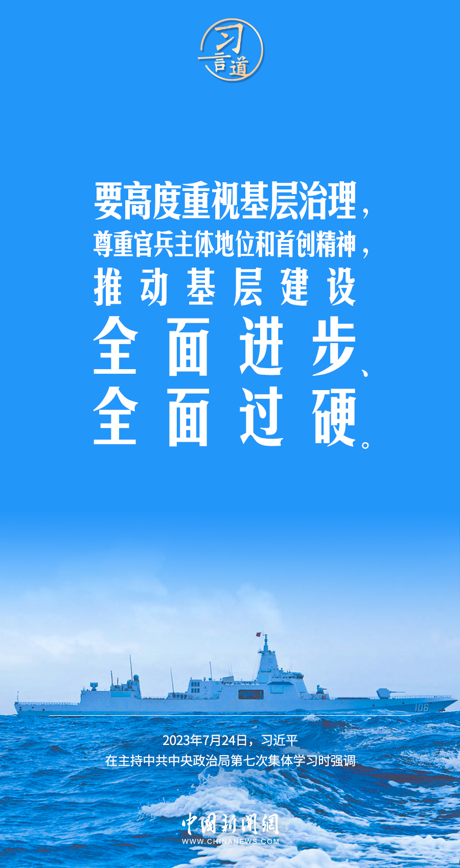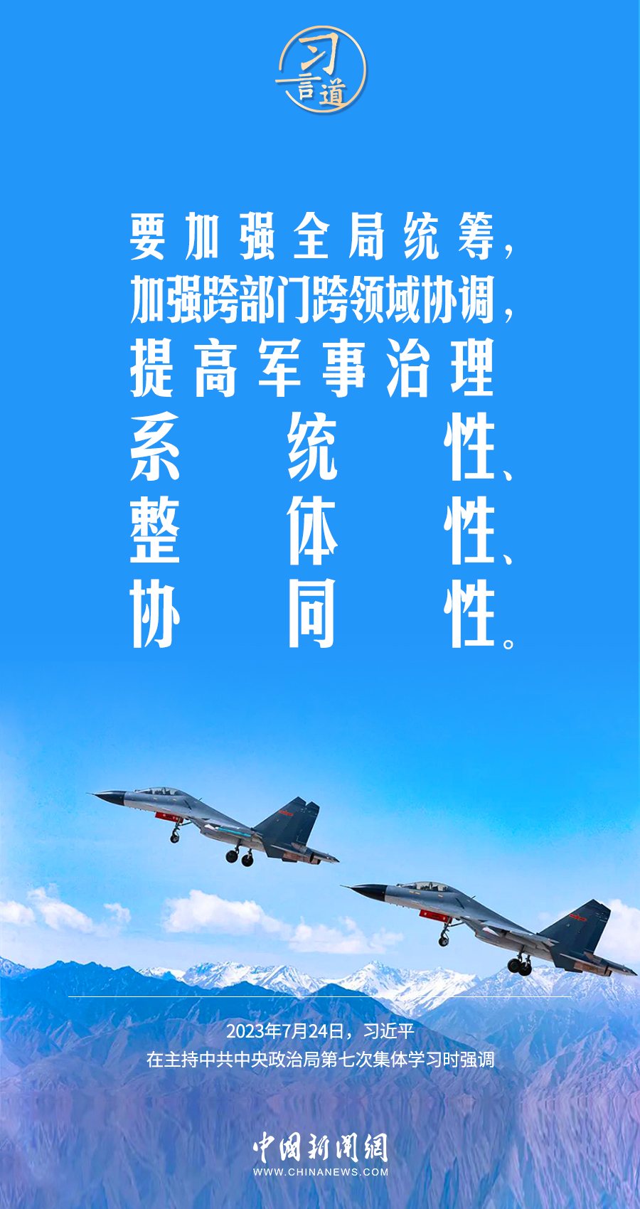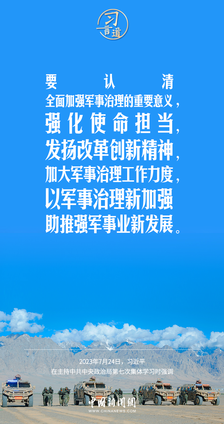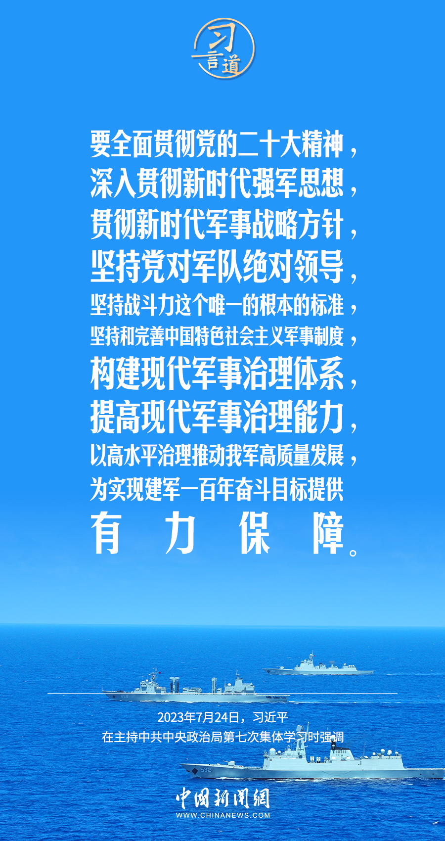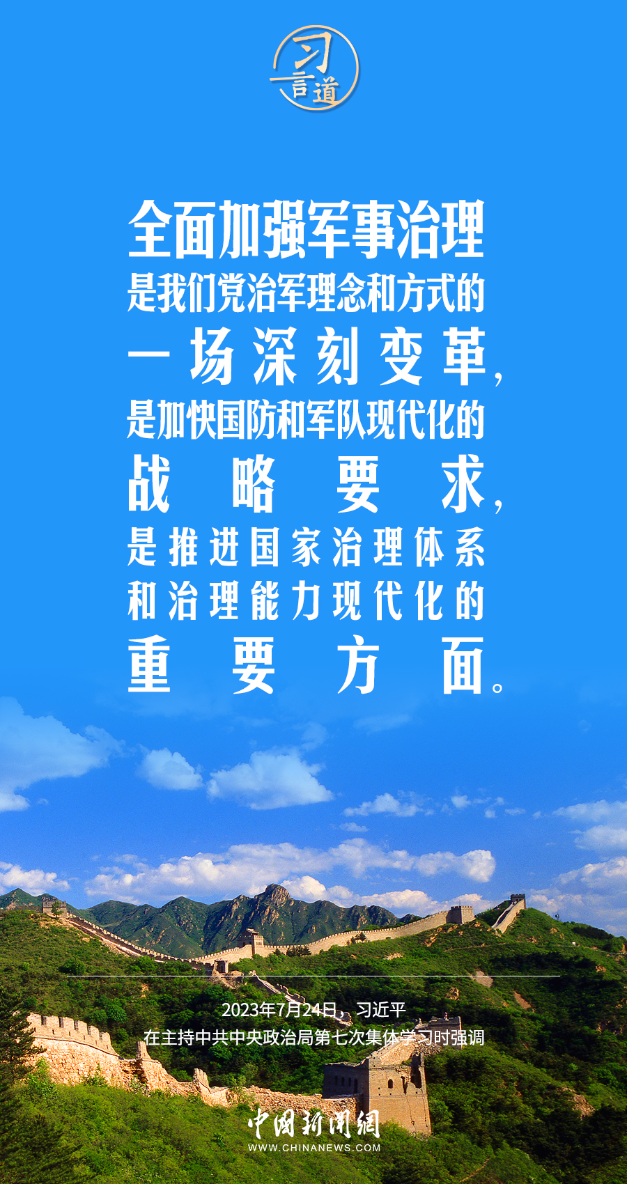 八一建军节来临之际,中共中央政治局7月24日下午就全面加强军事治理进行第七次集体学习。中共中央总书记习近平主持学习,他强调——