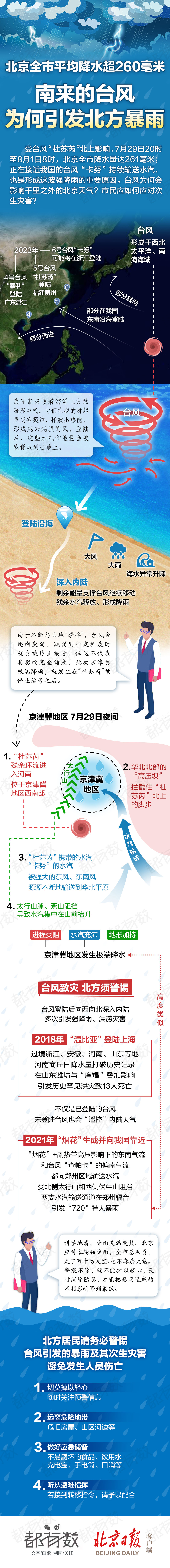 受台风“杜苏芮”北上影响,7月29日20时至8月1日8时,北京全市降水量达261毫米;正在接近我国的台风“卡努”持续输送水汽,也是形成这波强降雨的重要原因。台风为何会影响千里之外的北京天气?市民应如何应对次生灾害?