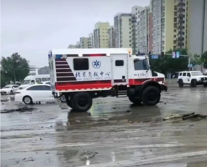 医生刘扬迅速带领团队人员前往,途中进一步了解情况。原来新生儿因早产,家属已联系转送到八一儿童医院,但由于路段淹水严重,道路险情还未解除,八一儿童医院的普通救护车行驶到半途无法继续前行。刘扬医生与团队迅速研判,决定驾驶全地形越野救护车前往门头沟区医院,接上新生儿,之后为八一儿童医院车辆引导相对安全路段,走出门头沟水灾区域。
