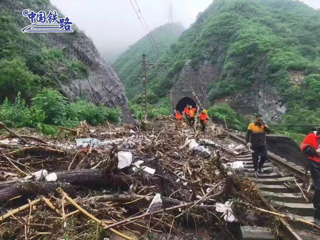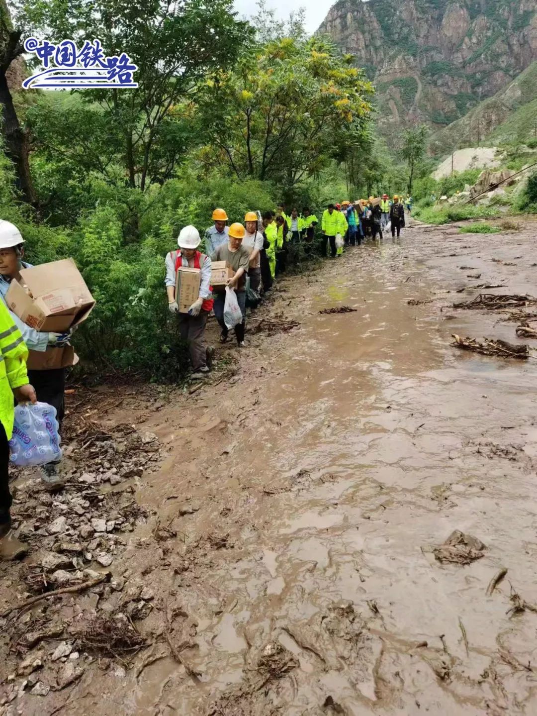 驰援K1178次列车最新进展:国铁北京局29名党员突击队员在队长刘亚军的带领下,面对沿途山体塌方、泥沙积水毫不畏惧,踏着多处厚达30厘米以上淤泥,肩扛手提食品及饮用水等生活物资,于今日10时左右,首先运抵停靠在沿河城火车站的K1178次列车上。