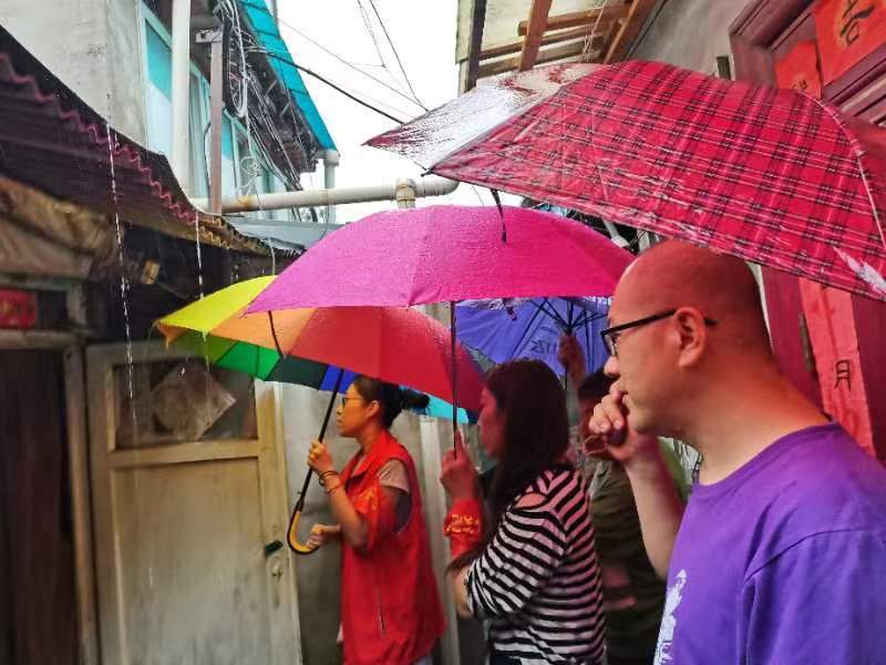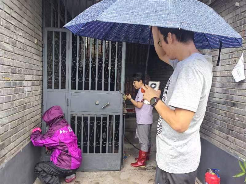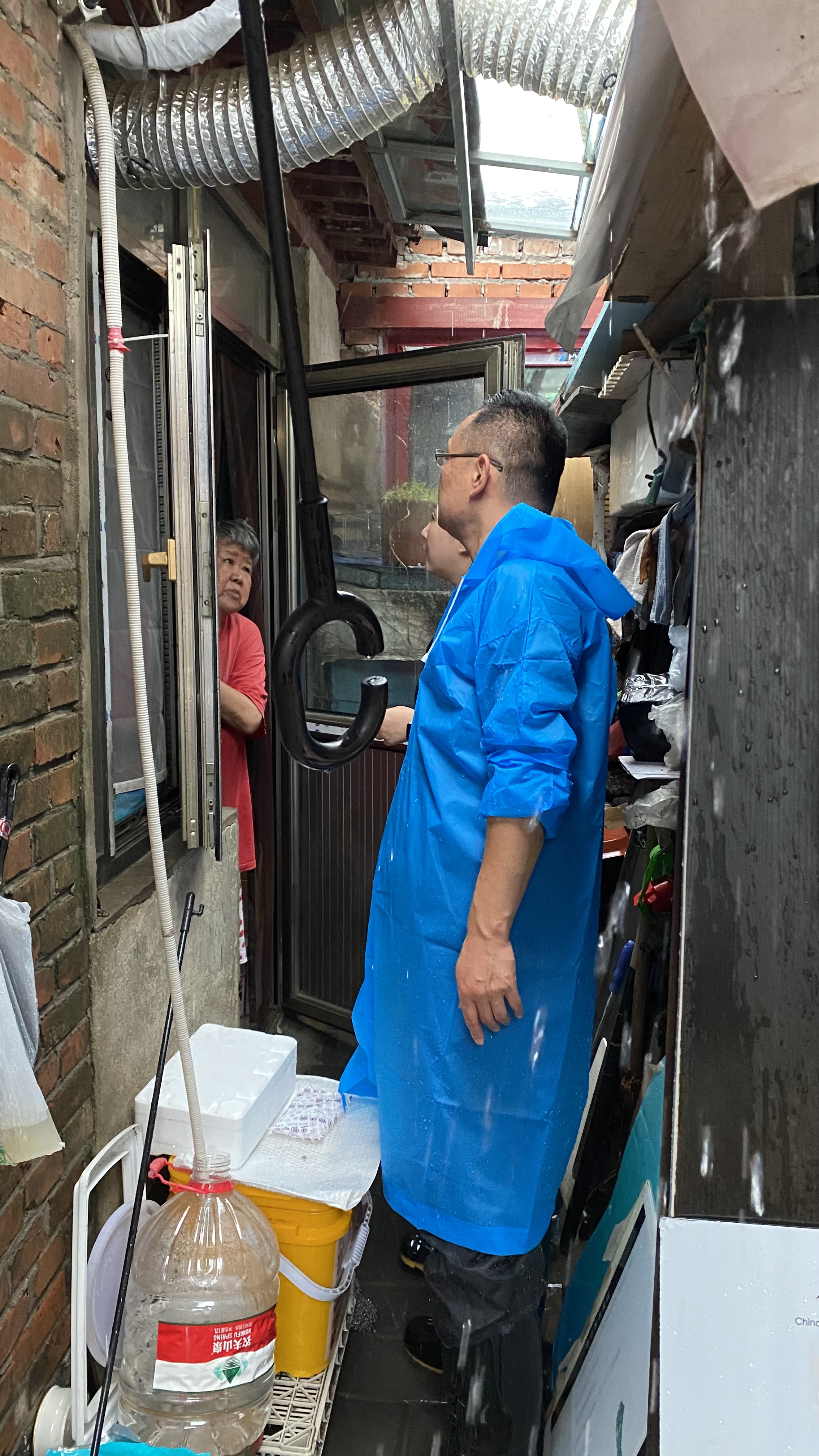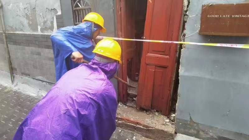 工作人员到前鼓楼苑胡同入户查看房屋漏雨情况