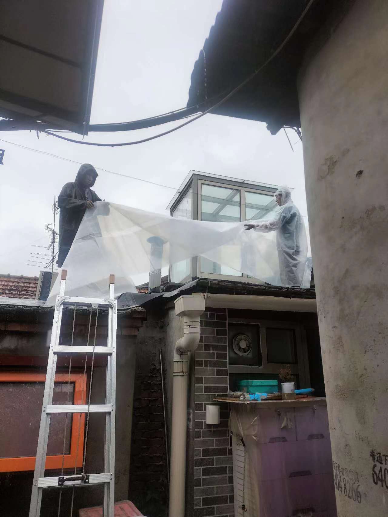 工作人员对板厂胡同26号居民屋顶进行苫盖