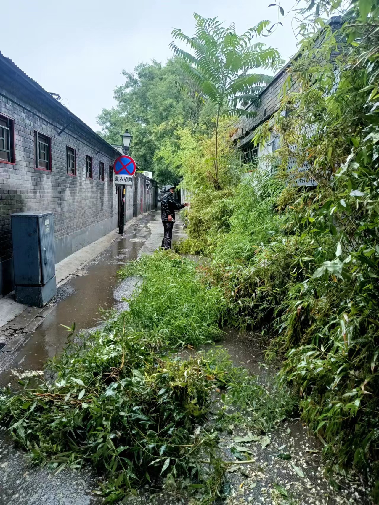 抢险队处理蓑衣胡同13号门前竹子倒伏