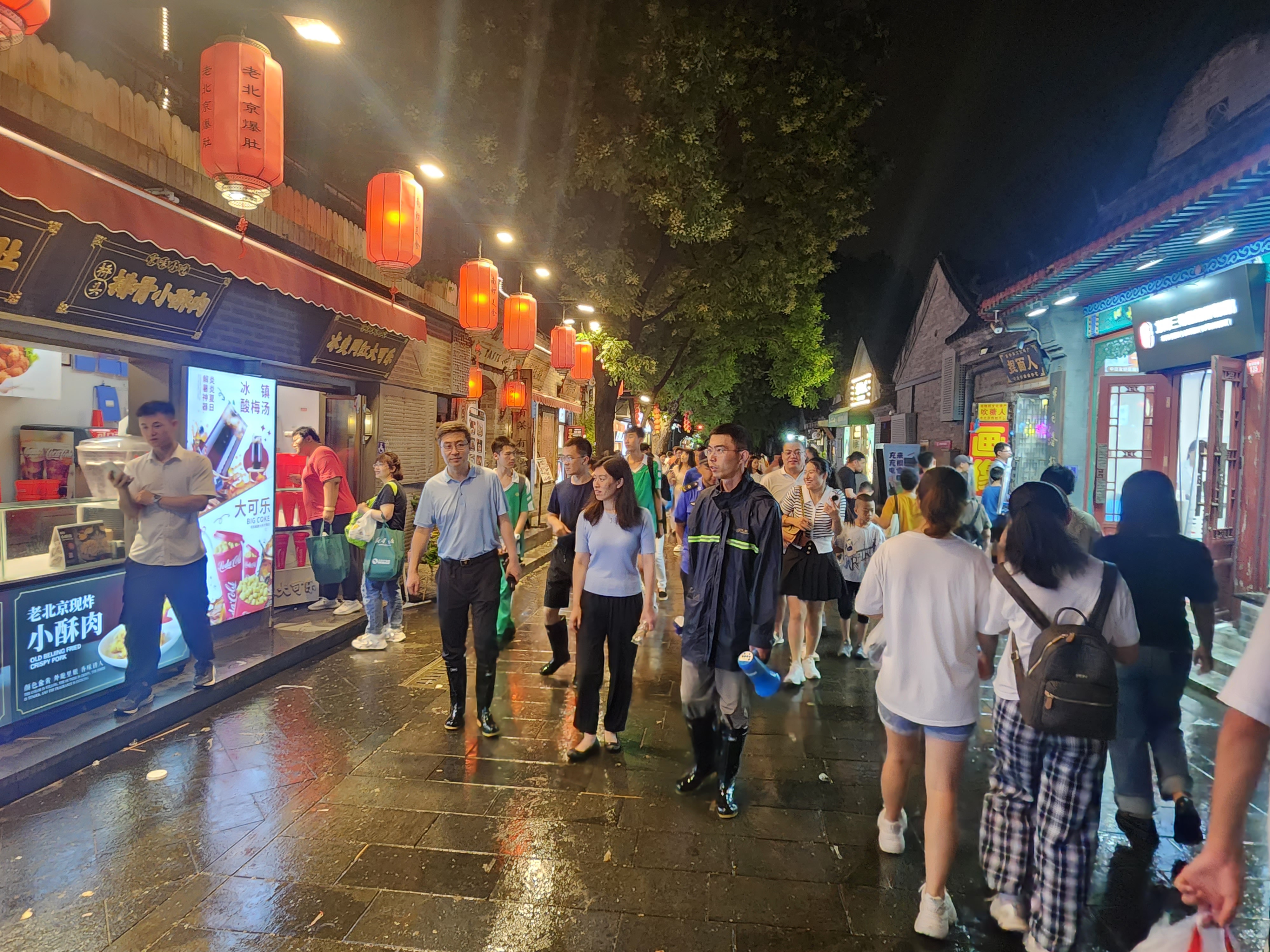 街道工作人员对南锣鼓巷商户进行防汛预警,并对游客开展有序疏散工作