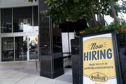 美国首都华盛顿一家餐厅门口打出的招聘广告资料图。图源:新华社