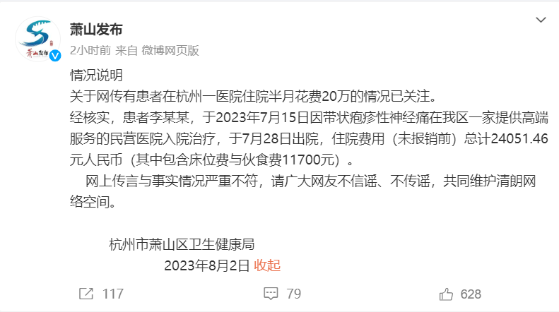 8月2日晚,浙江省杭州市萧山区人民政府新闻办公室官方微博发布情况说明,回应李某某杭州看病花费20万事件: