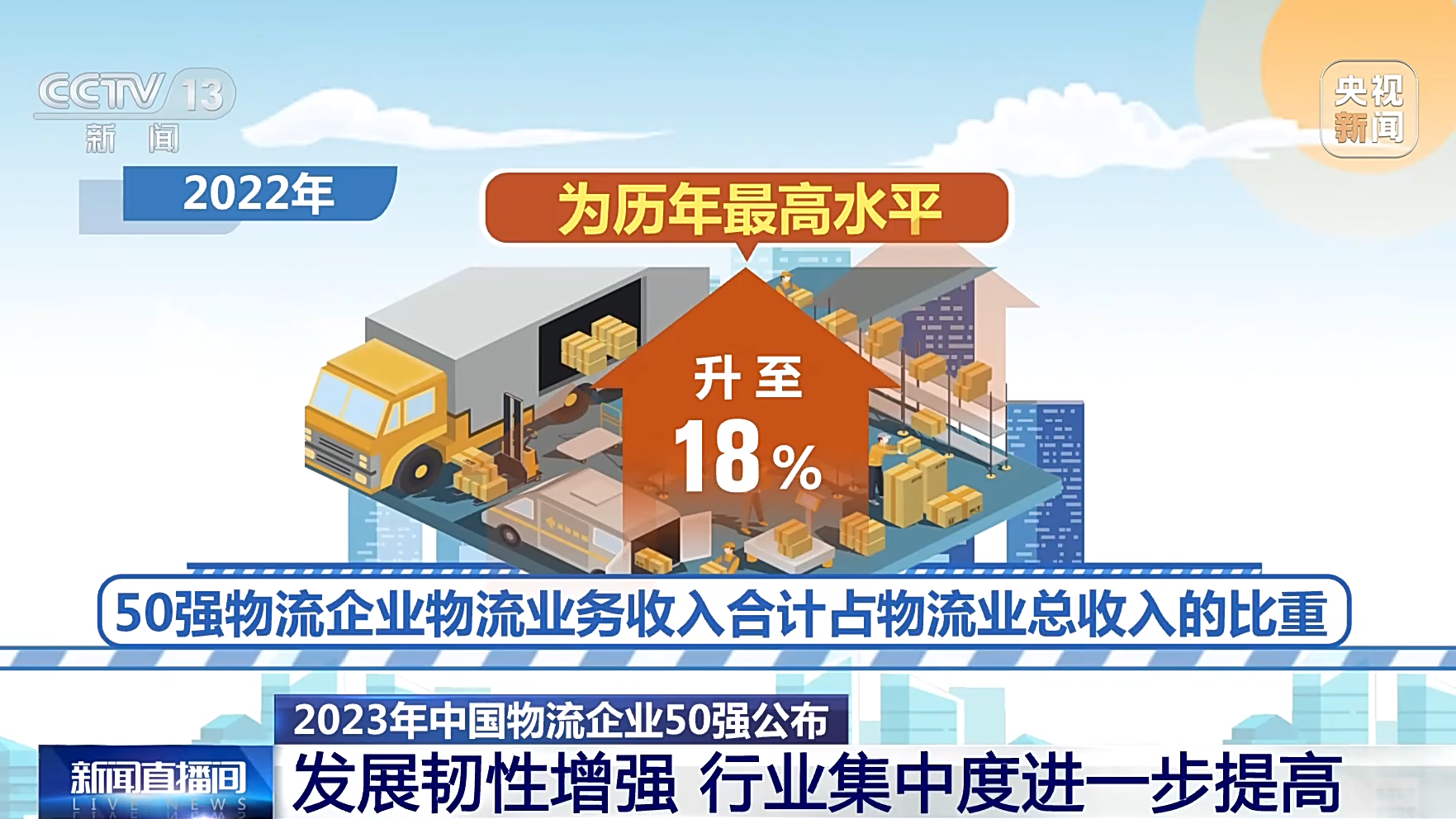 中国物流与采购联合会今天发布了2023年度中国物流企业50强。从物流业务收入占比来看,50强物流企业的物流业务收入占物流业总收入的比重升至历年最高,并且50强物流企业门槛大幅提高,显示物流行业发展韧性较强,行业集中度进一步提高。