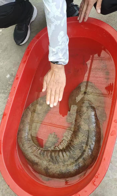 “我感觉和之前在网上看过的‘娃娃鱼’很像,所以赶紧把它抱回家中,并联系了村委会。”王春丽说。怕伤到这条鱼,她还在家找了一个较大的盆子用作临时安置。很快,碓臼峪村委会和十三陵镇农服中心的工作人员赶到家中。大家看到这条鱼后都很意外,只见它体重约有20多斤,皮肤光滑,头部钝圆扁平,四肢短小,因为保护及时没有明显外伤,一放在地上就四肢有力地爬动起来。
