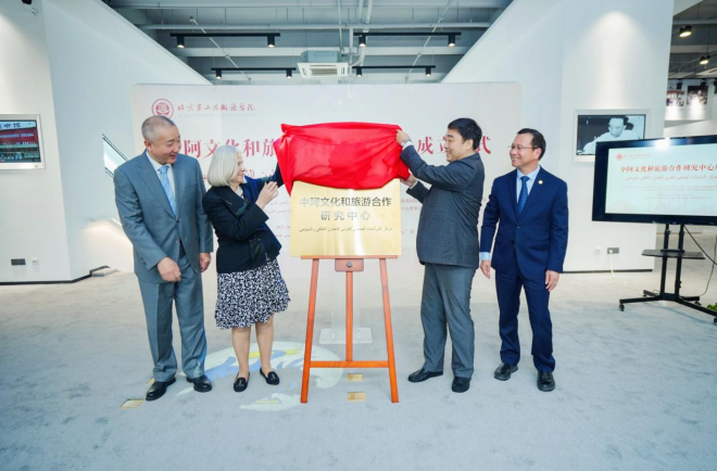 阿拉伯国家联盟助理秘书长海法(左二),文化和旅游部国际交流与合作局局长高政(左一),北二外党委书记常宇(右二),北二外党委副书记、院长计金标(右一)共同为中阿文化和旅游合作研究中心揭牌