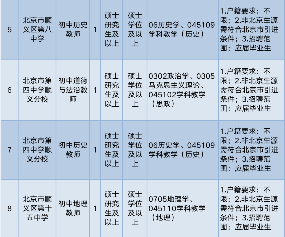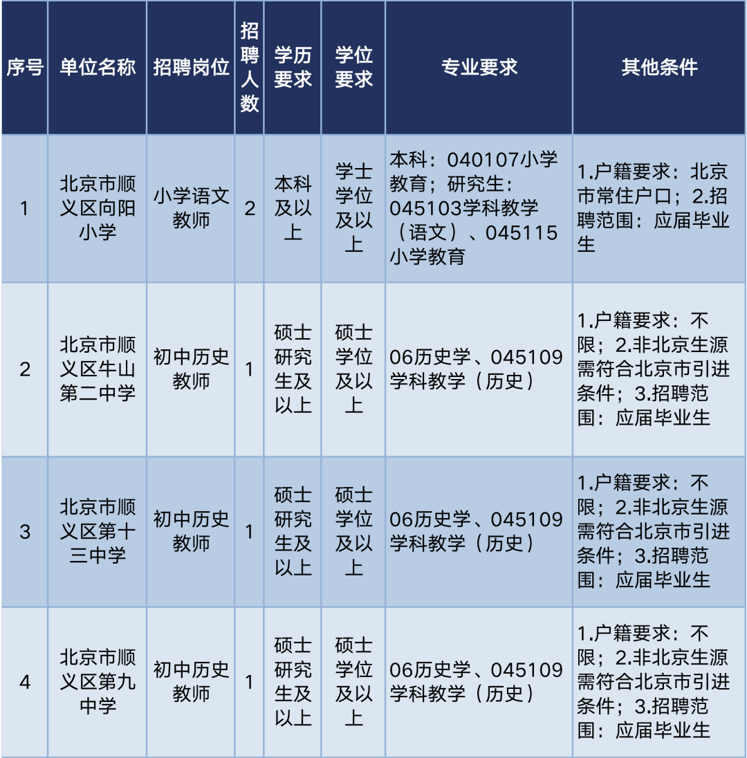 1.列入国家统一招生计划,培养方式为非定向(与顺义区教委签订北京市乡村教师计划定向培养协议的2023年应届师范类毕业生除外),在校期间未与任何单位存在劳动(录用、聘用)关系,按时毕业并获得相应学历、学位的国内普通高等院校2023年应届毕业生。