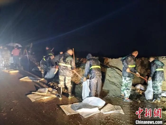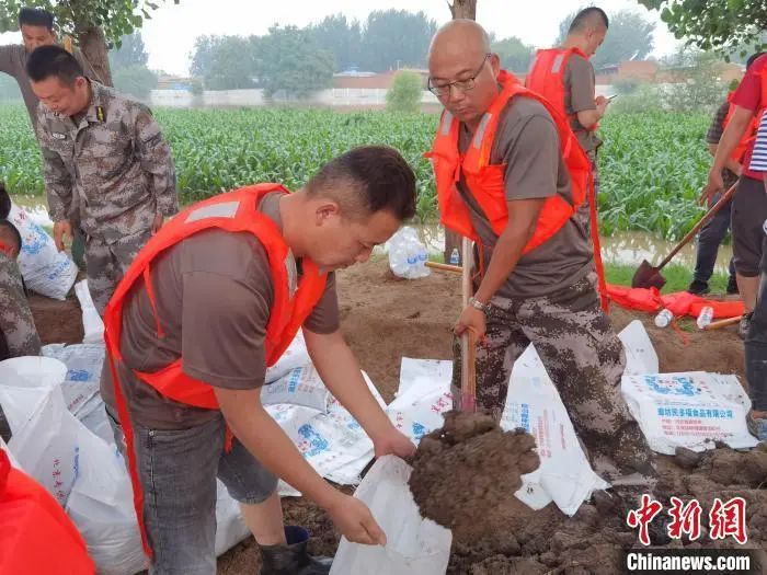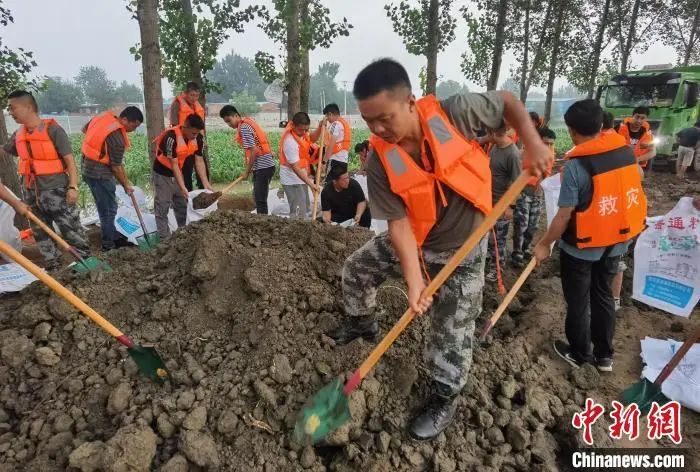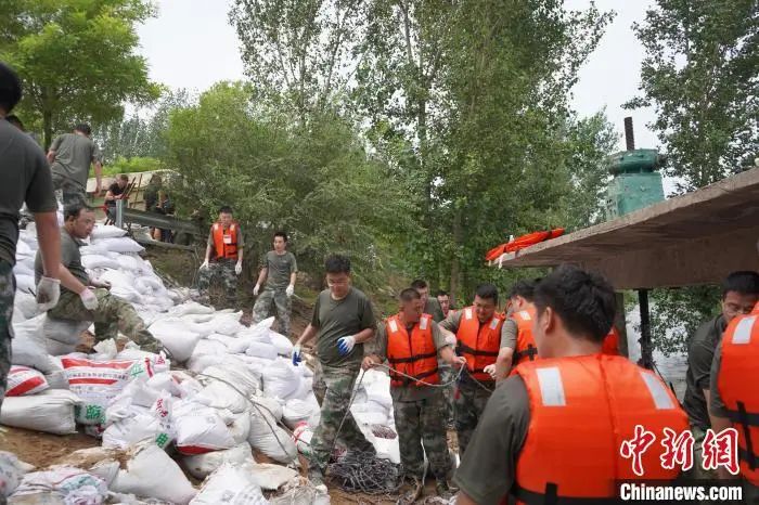8月2日晚11时,河北省廊坊市文安县新镇镇北舍兴村因上游行洪导致河道流量加大,水位上升至8.35米发生漫堤。110名基干民兵应急力量闻令而动,第一时间集结,火速前往险情地点,投入抗洪抢险一线,对堤坝进行加固。经过十余个小时的筑堤固坝,堤坝加高近1.5米,于8月3日上午11时圆满完成大堤加固任务。在东淀蓄滞洪区霸州市下段村防汛堤,霸州市人武部127名基干民兵正在对发生渗水的防汛堤进行加固维护,经过6小时全力奋战,截至3日16时险情消除,大堤安置无恙。