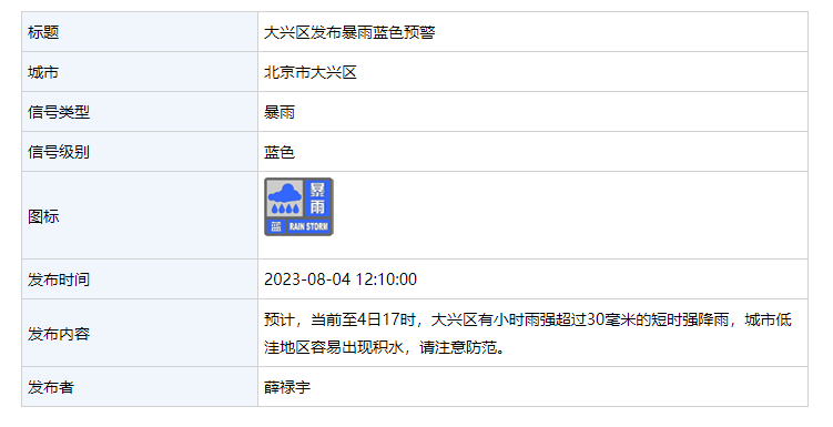 大兴区发布暴雨蓝色预警:有小时雨强超30毫米短时强降雨