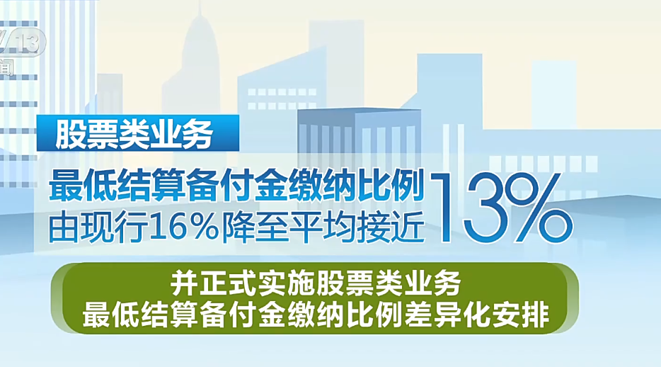 股票类业务最低结算备付金缴纳比例由现行16%降至平均接近13%,并正式实施股票类业务最低结算备付金缴纳比例差异化安排。据有关方面测算,此次调降后,月均备付金规模将下降约300亿元。