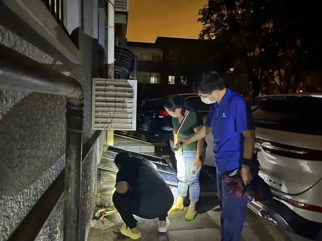 前门街道机关干部及社工在前东社区巡查,查找各处淤积原因并清理积水。