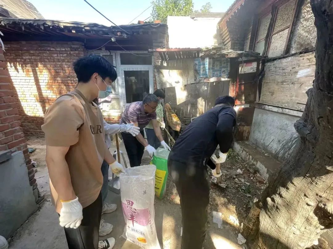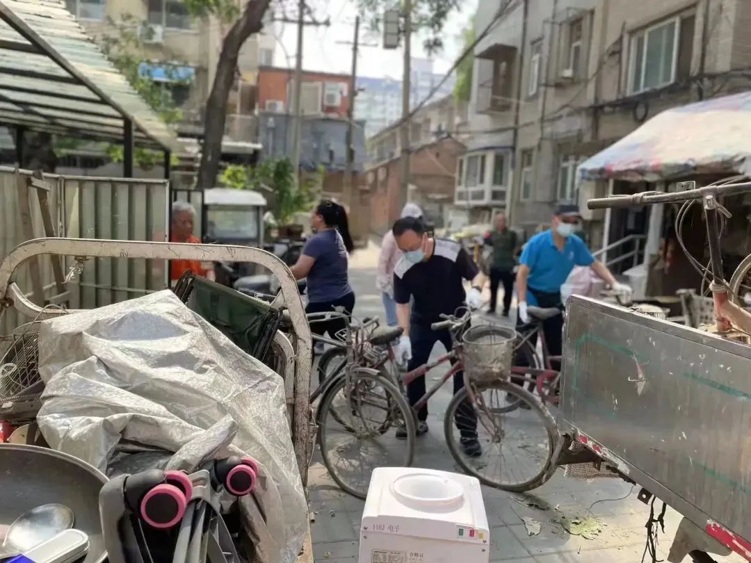 北新桥街道北新仓社区组织居民一起清理废旧自行车;青龙社区动员辖区共建单位对炮局18号院内遗留杂物进行清理。此外,民安社区社工对老年公寓周边树木、电线隐患进行巡查。