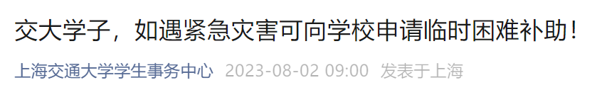 为及时向遇紧急灾害的学生提供关心和帮助,特向全体交大人(含2023级新生)公告:学校临时困难补助通道随时开放,如您及您的家庭遇到各类紧急灾害、突发事件(不限于台风灾害),请第一时间将情况告知您所在院系的思政教师、辅导员,同时可向学校申请临时困难补助。