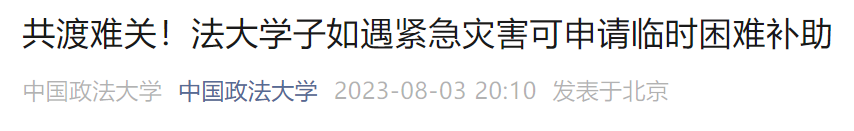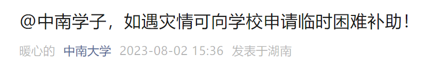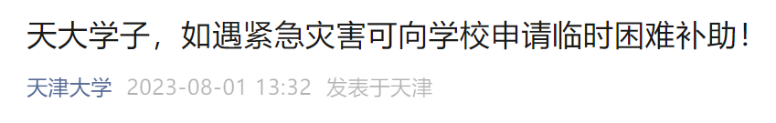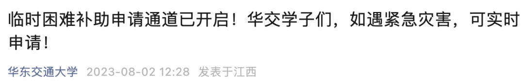 8月2日,“华东交通大学”公众号发布消息:临时困难补助申请通道已开启!华交学子们,如遇紧急灾害,可实时申请!