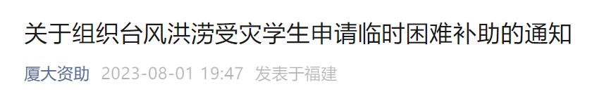 暑期因台风、洪涝等自然灾害或突发情况导致家庭经济困难的2023级本科新生,请关注随录取通知书寄送的资助政策,入校后请及时与辅导员联系,学校将开设专项资助通道,尽心竭力为大家排忧解难。