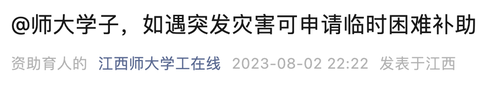 8月2日,“江西师大学工在线”公众号发布消息:@师大学子,如遇突发灾害可申请临时困难补助