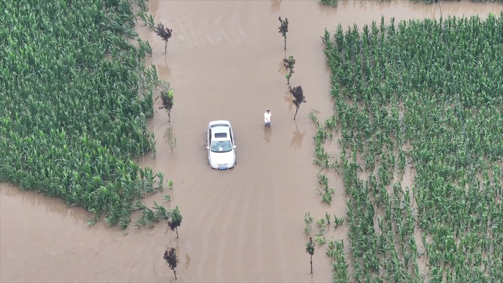 2023年8月4日,吉林舒兰,车辆涉水穿过洪水。图片来源:视觉中国