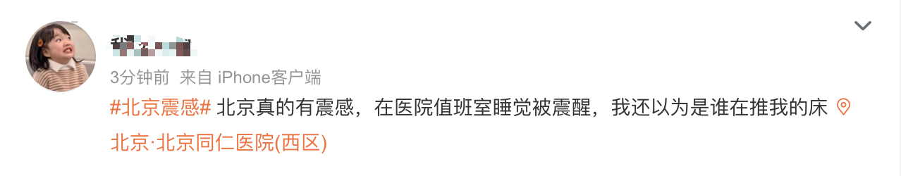 北京、天津、河北等地网友称有震感,还有不少网友在睡梦中收到手机地震预警而惊醒。