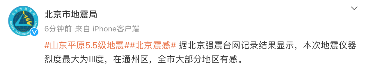 山东平原县发生5.5级地震,据北京强震台网记录结果显示,本次地震仪器烈度最大为III度,在通州区,全市大部分地区有感。