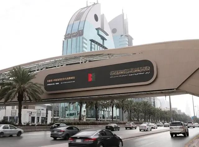 ▲2022年12月7日在沙特阿拉伯首都利雅得街头拍摄的关于“中国-海湾阿拉伯国家合作委员会峰会”的宣传屏。(王东震 摄)