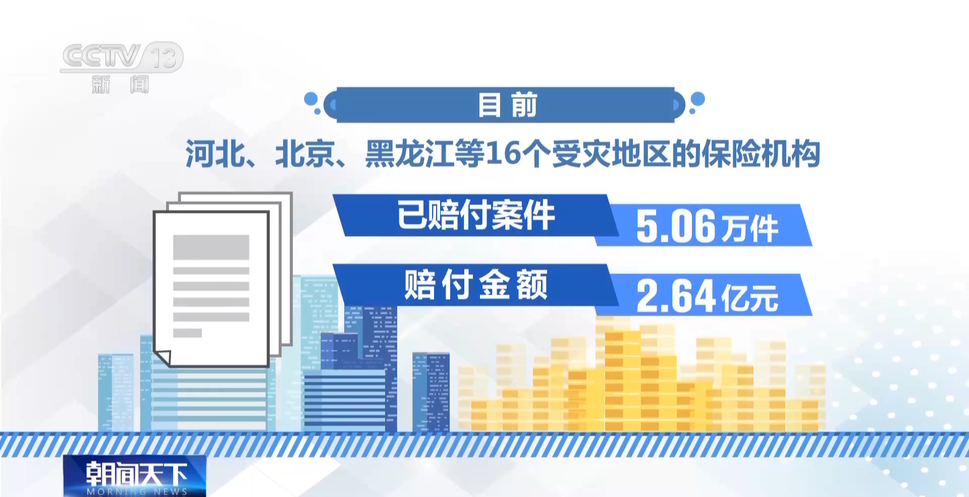 国家金融监督管理总局还要求受灾地区启动理赔报损信息24小时报告制,持续跟进灾情报案统计和理赔进展,进一步提升处置效率。截至8月6日上午10时,河北、北京、黑龙江等16个受灾地区的保险机构收到保险报案18.91万件,估损金额62.41亿元。目前已赔付案件5.06万件,赔付金额2.64亿元。