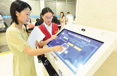 江苏东海县行政审批局工作人员在政务服务中心大厅自助服务终端指引市民办理业务。张 玲摄(人民视觉)