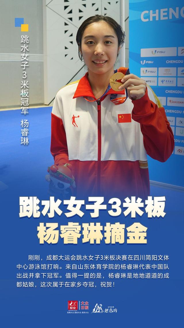 8月6日,成都大运会女子3米跳板决赛在四川简阳文体中心游泳馆打响。来自山东体育学院的杨睿琳代表中国队出战并拿下冠军。值得一提的是,杨睿琳是地地道道的成都姑娘,这次属于在家乡夺冠,祝贺!