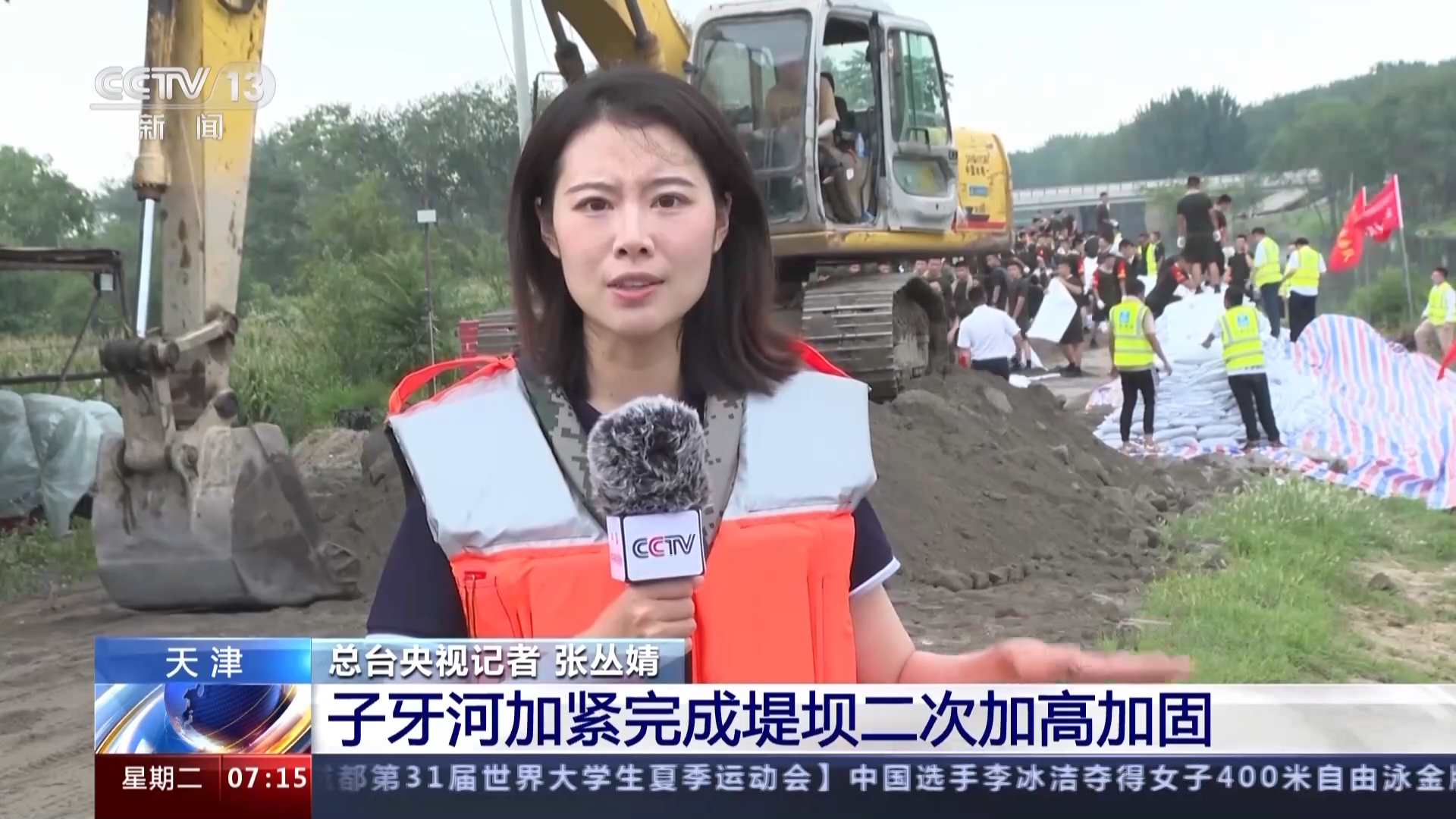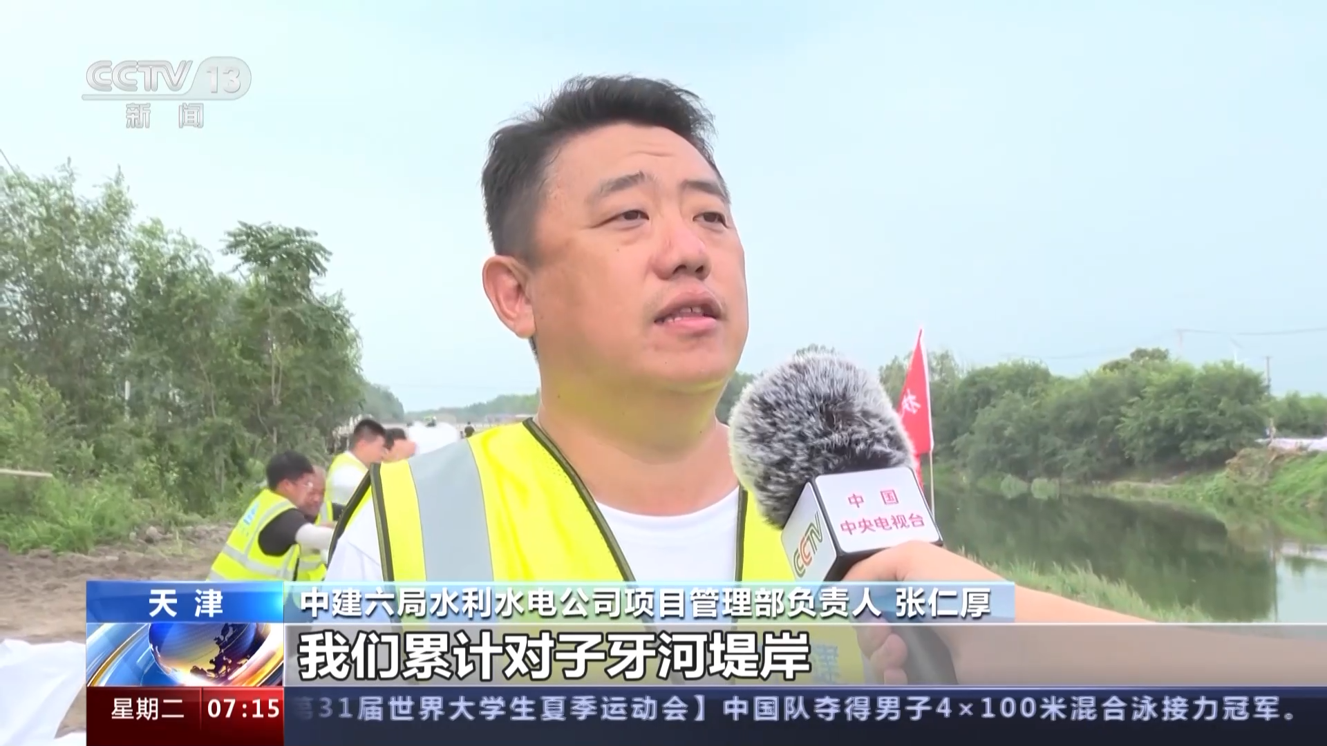 中建六局水利水电公司项目管理部负责人 张仁厚:我们累计对子牙河堤岸进行7.9公里的加高加固。接到紧急施工任务以后,我们迅速抽调人员、设备,将子牙河左岸堤坝由7米加高到8米,此项工作一到两天内施工完成。
