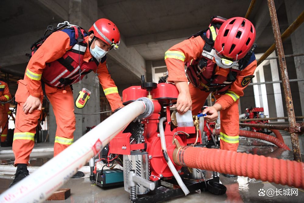8月7日,邢台市消防救援支队队员在河北省涿州市一处工地进行排涝作业。新华社记者朱旭东 摄