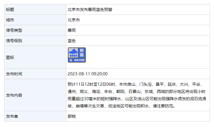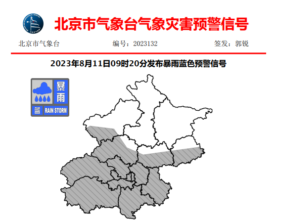 8月11日,北京市气象台发布暴雨蓝色预警信号: