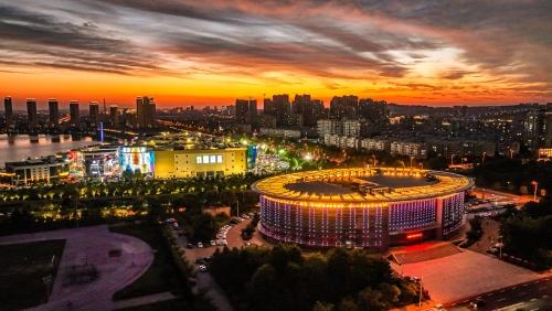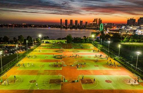 8月10日夜间,在荣成市樱花湖体育公园,市民们在漫步、游玩、健身,乐享夏日好时光。