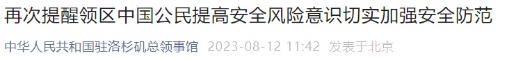 今年7月以来,我馆已多次发布关于加强安全防范的领事提醒。现再次提醒已在或拟来领区旅行的中国公民,在当地外出旅行务必提高安全风险意识,提前了解当地安全风险和治安状况,不轻易与陌生人交往、同行或搭便车,避免单人出行或前往人烟稀少、自然条件恶劣地区,不轻易透露个人信息,不显财、不露富,同家人保持经常性联系,及时将拟前往的具体地点、停留时间、酒店电话等信息告知亲友。