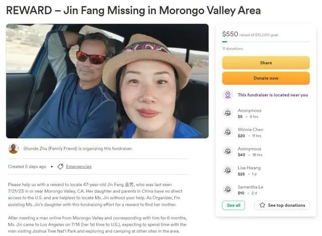 目前,金芳在国内定居的父母和女儿已在募捐网站发起筹款,希望募集1万美元用于奖励提供金芳线索的报料人。