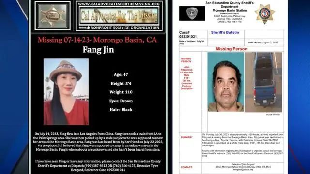 报道援引金芳友人消息称,7月14日,金芳从中国出发抵达洛杉矶,约翰于次日在加州棕榈泉车站接她,并计划一同前往加州约书亚树国家公园游玩。但从7月22日开始,金芳与家人的联系突然中断,电话和社交媒体均无法联络。7月24日,在约翰的手机最后一次对外通话后,二人彻底失联。圣伯纳汀诺县警方已发布了寻人启事,向网民公开征集有关金芳和约翰的行踪,金芳的女儿也在网上发了多条寻人启事,希望网友帮助寻找母亲。