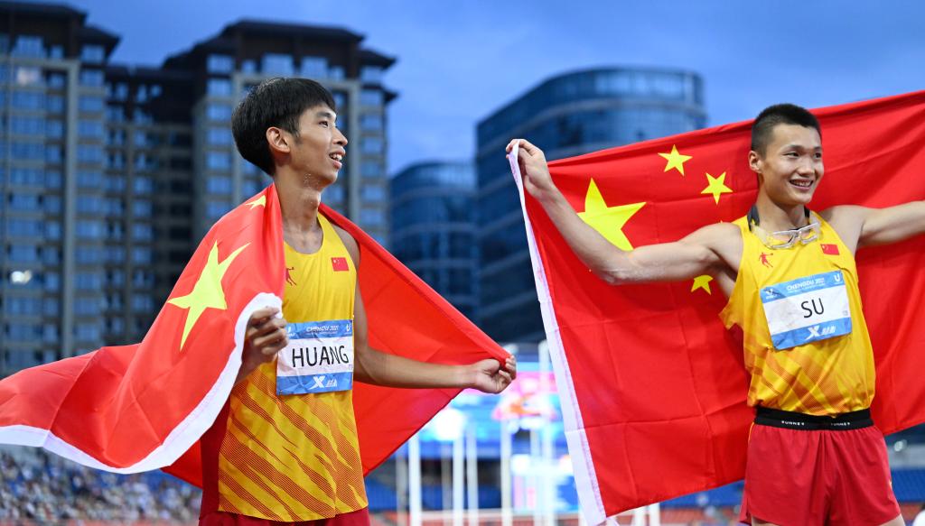 8月3日,中国选手黄华锋(左)和粟文在成都第31届世界大学生夏季运动会田径项目男子三级跳远决赛后庆祝。黄华锋以16米76的成绩获得季军。新华社记者 邓华 摄