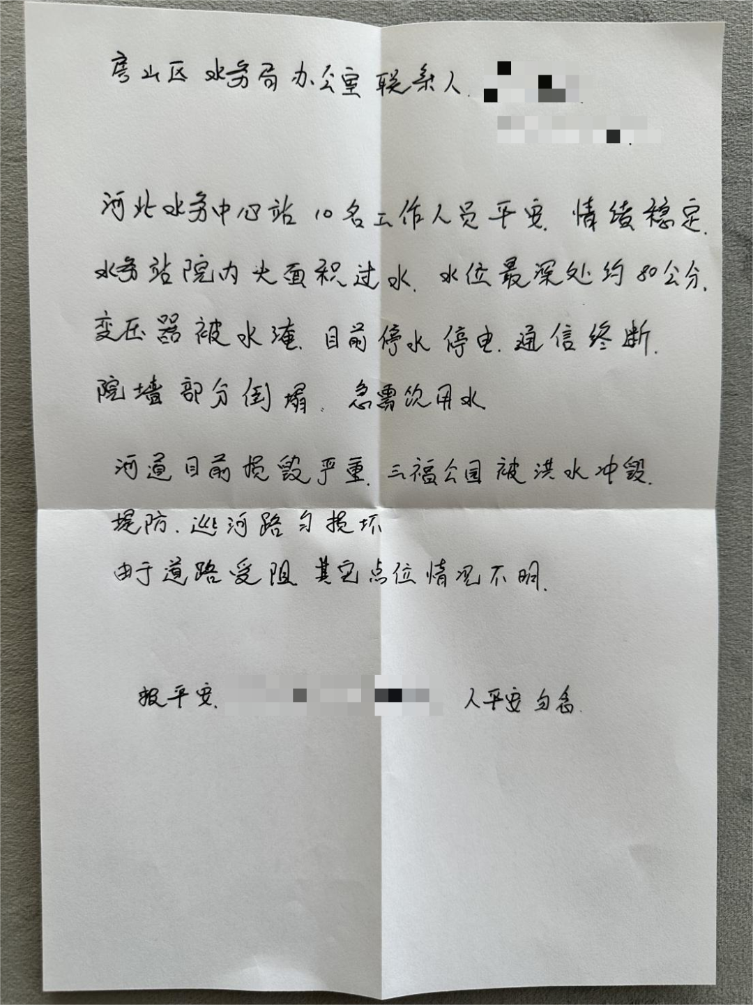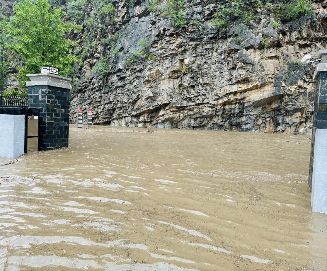 见水位缓慢下降,游世鹏带领大家出院到旁边三福村、河东村查看受灾情况,发现108房东路已被洪水冲断,期间遇到徒步下山的蓝天救援队队员,便委托他们将手写记录的北部山区大石河过流情况和受灾情况带出山交给局指挥部。