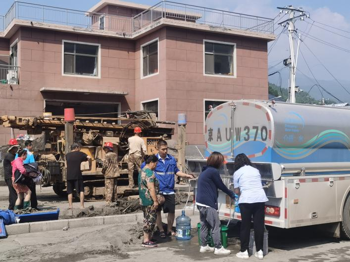 (8月8日,在佛子庄乡西班各庄村应急供水现场安排水车和打井机为群众实现供水)