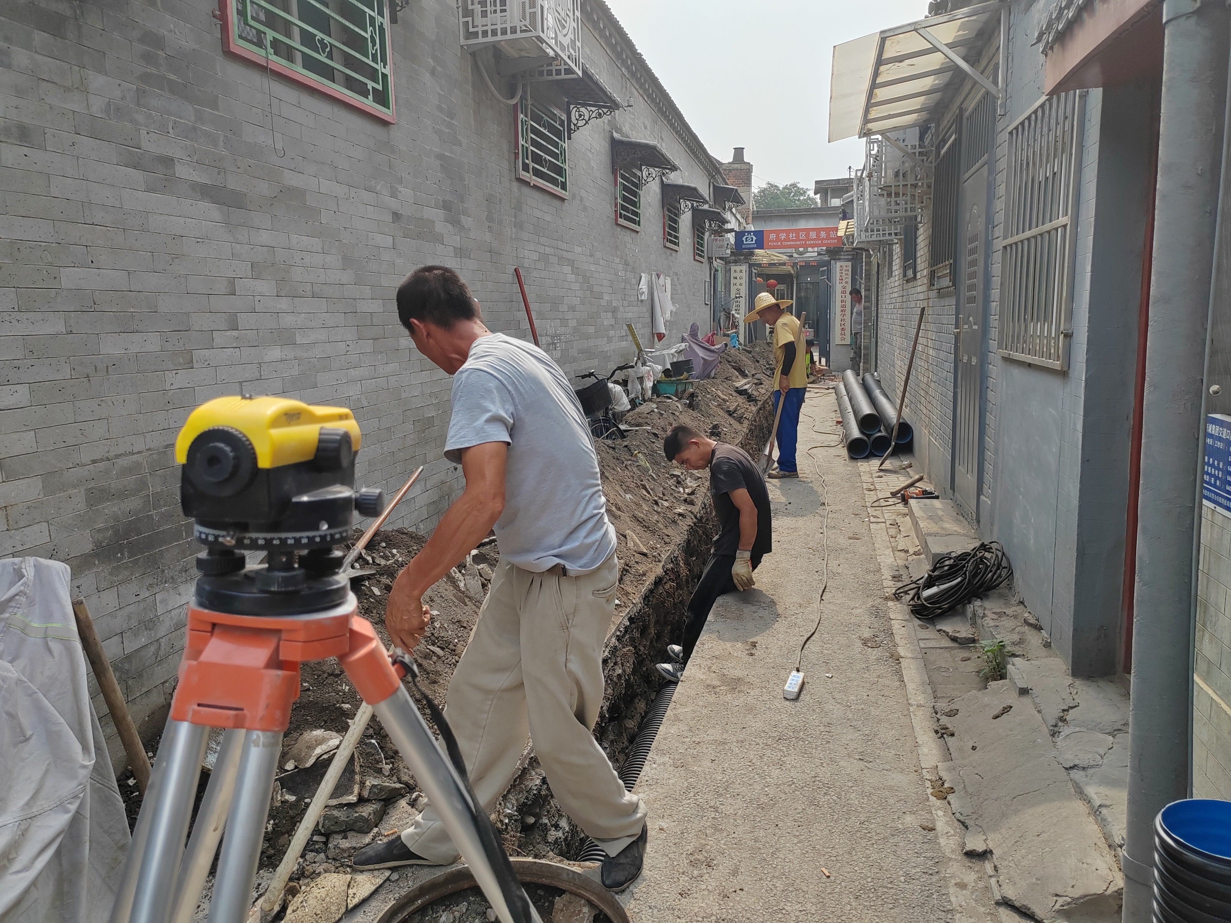 沿着南北两条管子要找到究竟是哪一家哪一户在用这口渗水井是非常困难的,可能涉及多个院落、多间房屋,而破路施工同样不现实。最终各方研究决定,在这口渗水井下先接一条“三通管”,把两个管口和胡同排水主管道接驳在一起,避免污水下渗困难而满溢的情况。