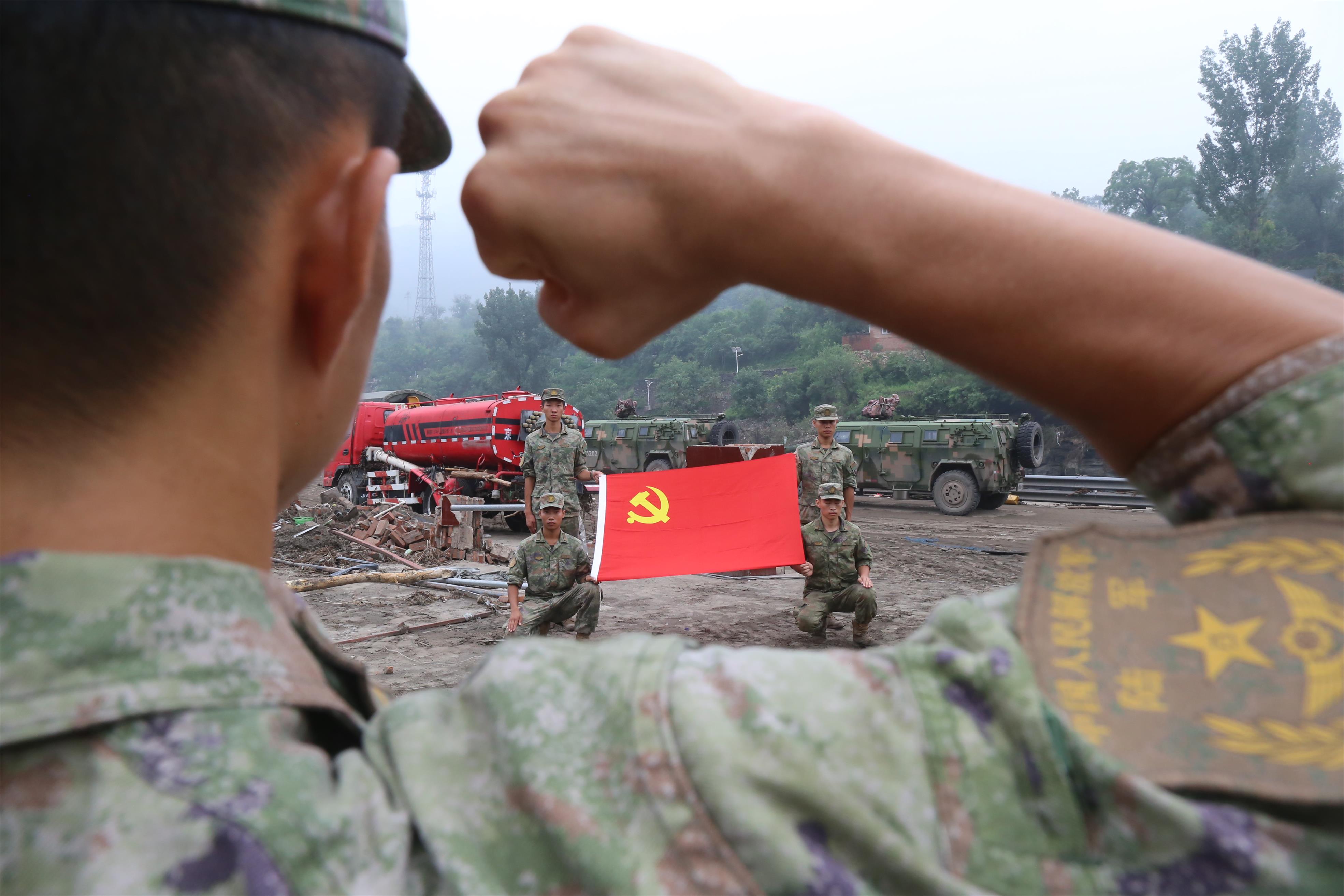 “我志愿加入中国共产党……随时准备为党和人民牺牲一切,永不叛党。”近日,陆军第82集团军某旅在房山抗洪清淤现场举行了一次特殊的入党仪式。6名同志因在抗洪抢险任务中表现突出,被组织特批火线入党。面对党旗,他们庄严宣誓。