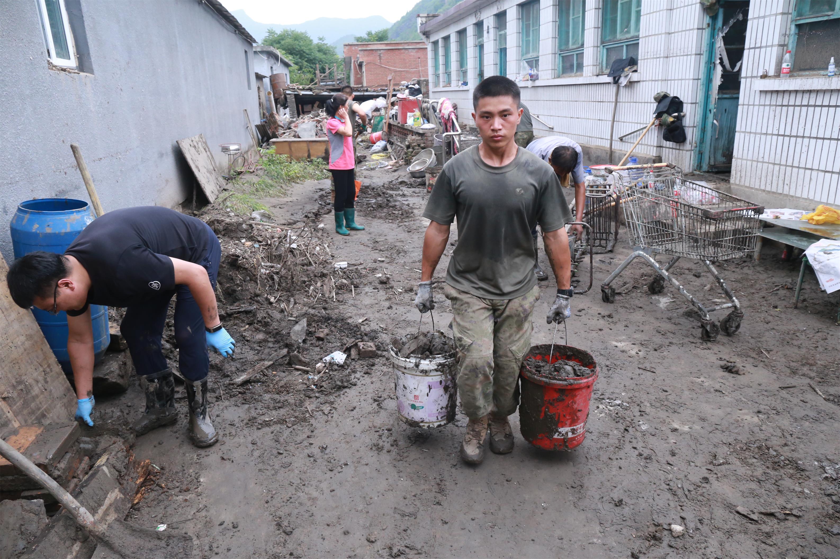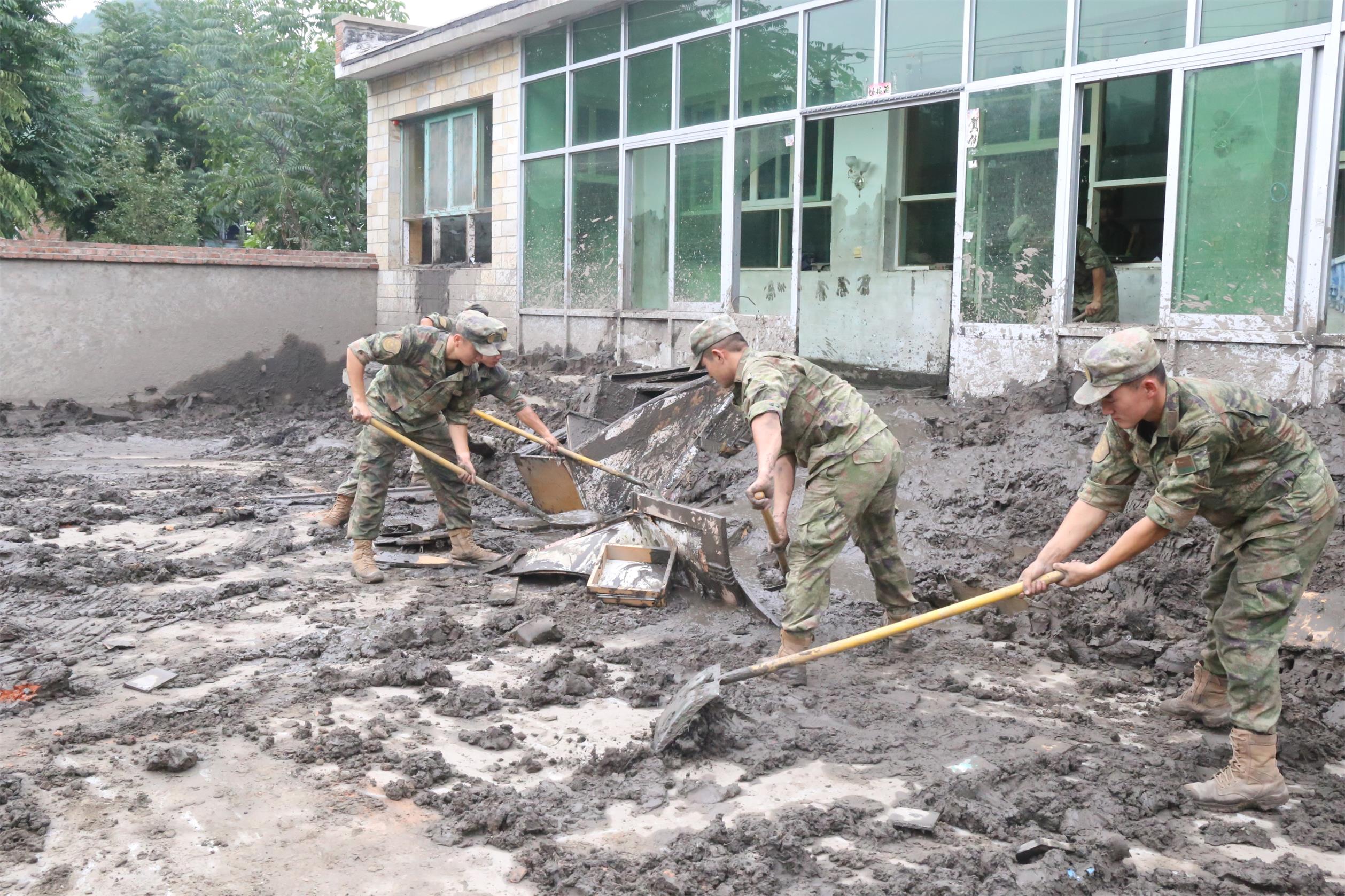 搜救任务完成后,党员突击队又立即投入到清淤工作当中。洪水过后天气闷热,淤泥腥臭,他们发扬不怕苦、不怕累的精神,争着干、抢着干,迷彩服每天被汗水打湿,被淤泥浸透。