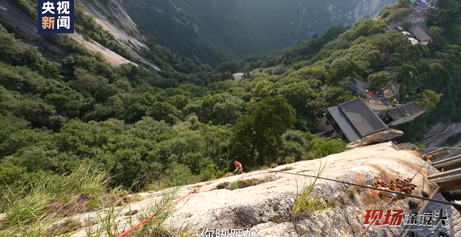 这么多垃圾,如何清运出山?现场画面相当惊险。近乎垂直的90度悬崖上,环卫工绑着安全绳,一步步攀爬,用双手捡拾着山峰上的垃圾;陡峭的狭路上,又得肩扛担挑、小心翼翼,以防脚下踩空。如此工作,风险系数之高,着实让人悬心。可这些垃圾不及时清理又不行,一则破坏景区美感,“白色垃圾”、瓶瓶罐罐不时收入镜头、闯进视野,太煞风景;二则威胁景区生态,汤汤水水泼洒到松树根系上,会影响树木生长,塑料等制品长期融入,则会造成土地贫瘠化。这些“橘色身影”冒着危险登高爬低,默默还游客以美景,还生态以健康,令人感动。