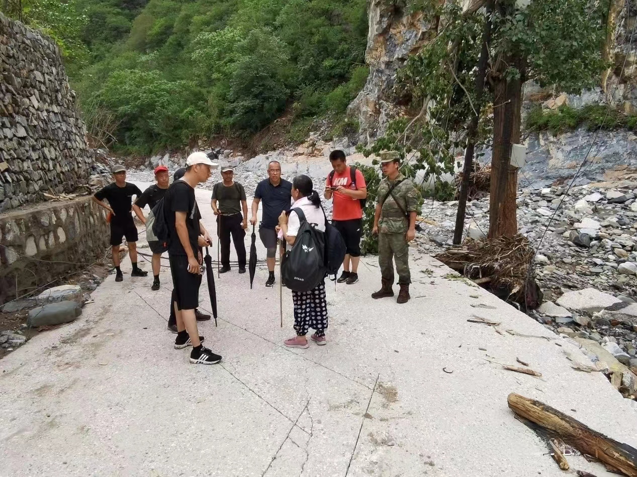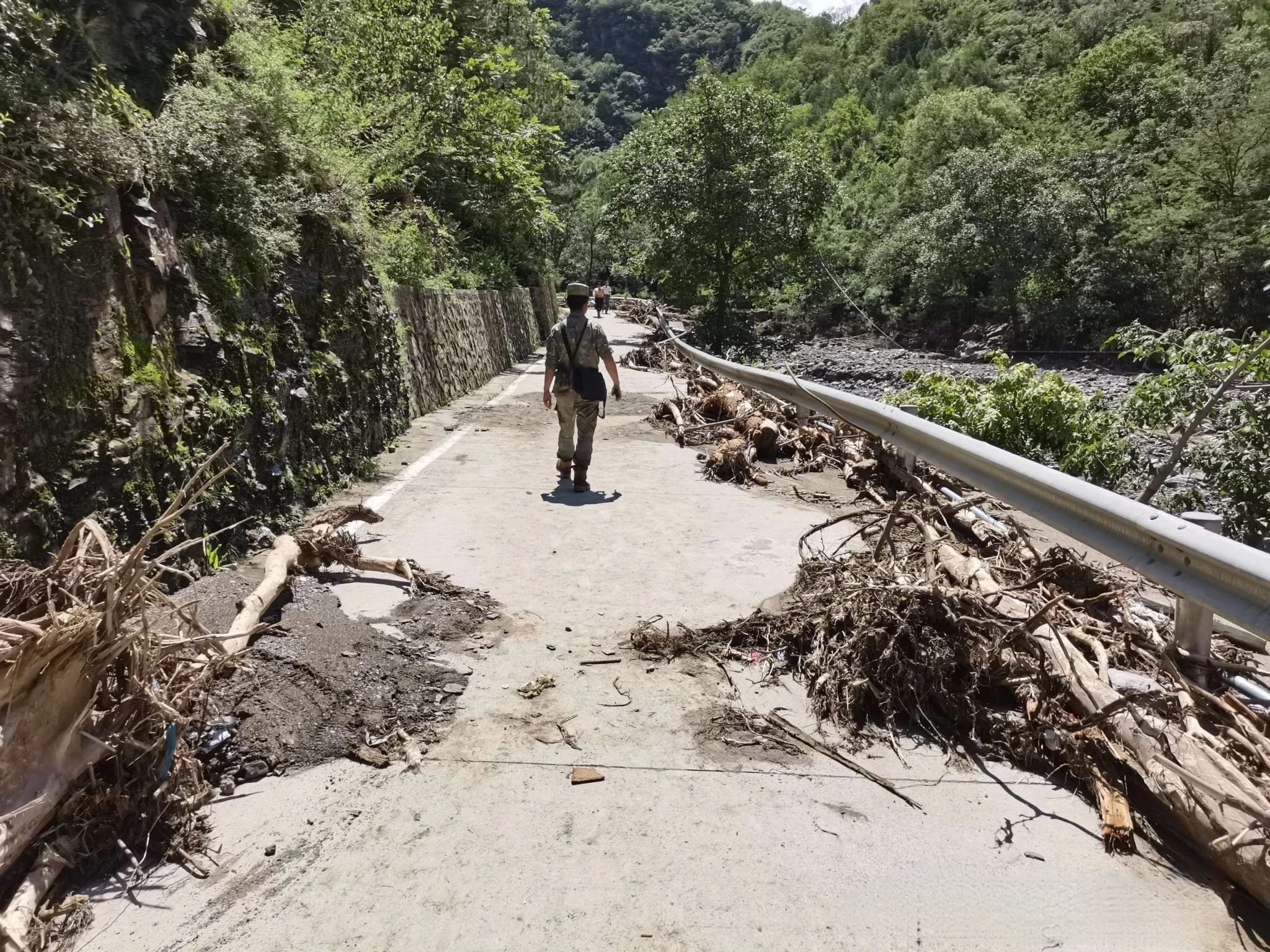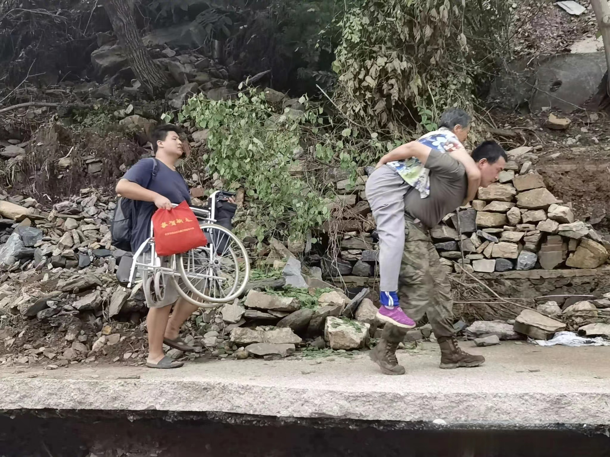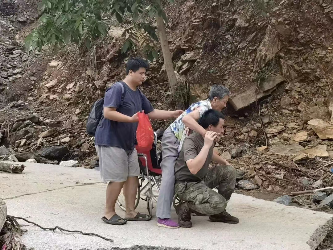 熊睿和刘颢天奉命徒步前往四面环山的杨林水村,协助当地政府建立通信、疏散群众,当时的村庄被山洪席卷后便成为了一座“孤岛”。上午10时许,两人来到杨林水村一队,断壁残垣间看到一对中年夫妇推着轮椅上的老母亲蹒跚前行,豆大的汗珠挂在两人脸上,旁边跟着他们的小孩。