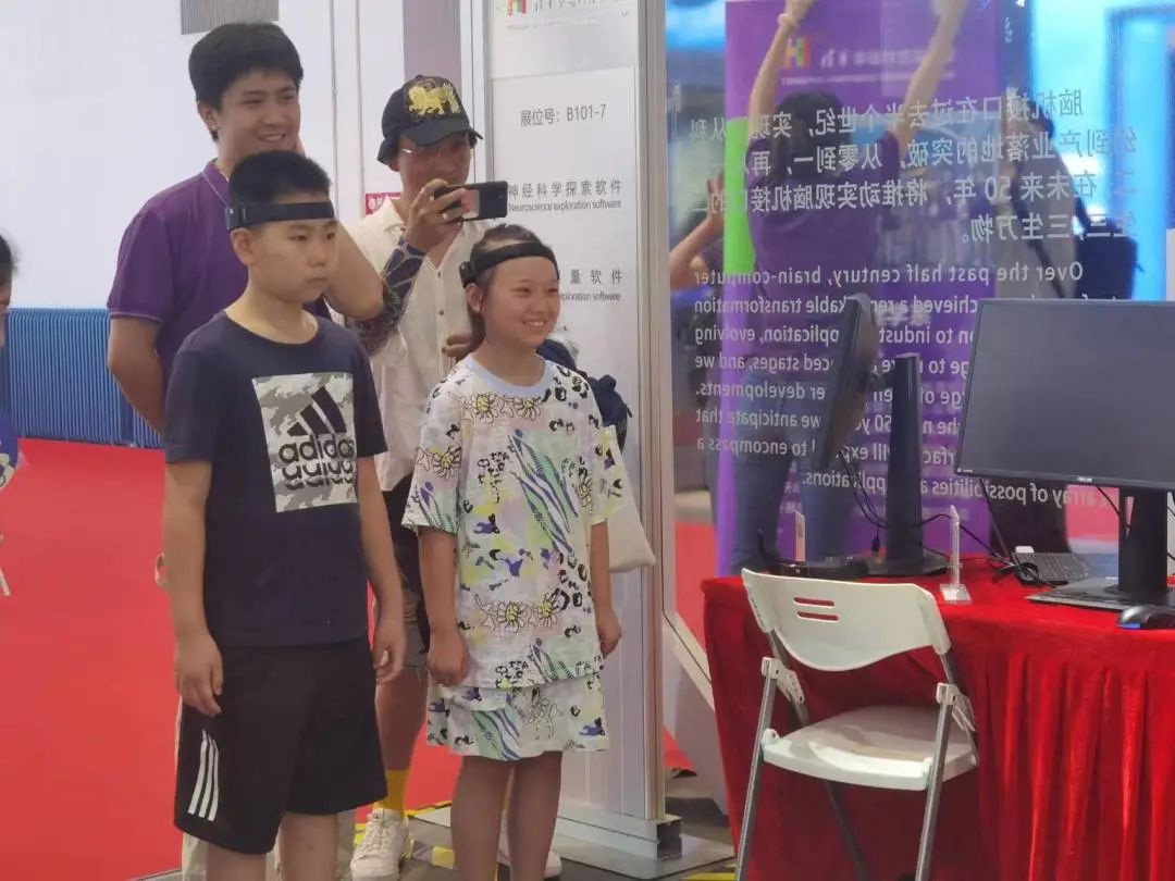 “您只要用‘意念’想象就行,身体不需要做出任何其他提示或刺激。”在脑机接口展区,在现场研究人员的指导下,“体验官”们戴着黑色脑电帽,仅凭意念就完成了让面前小车的前进、转弯等操控。这项游戏使用通过稳态视觉诱发电位(SSVEP)控制机器人,让它与环境和人类互动,即人们在看到不同频率的视觉刺激时,大脑的枕叶会产生对应频率的脑电信号。“通过采集,识别,处理这些脑电信号,我们就可以确定体验者所看到的命令,最后将对应的命令发送给小车完成指令。”据现场工作人员介绍,在脑机接口的研究范式中,稳态视觉诱发电位技术具有短交互、高准确度、安全性高、应用面广等优势,目前该技术已应用于儿童注意力测试、智能轮椅等多个应用场景。