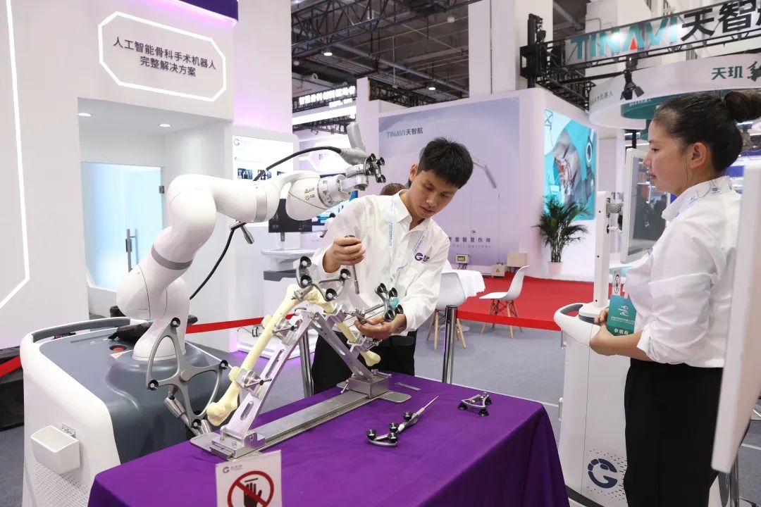 北京长木谷医疗科技有限公司现场首发的创新一代人工智能骨科手术机器人ROPA,基于人工智能的髋膝关节三维重建手术辅助系统,由“智慧脑+智慧手+智慧眼”组合而成。“智慧脑”作为医生的超级大脑,仅需患者CT即可帮助医生在术前5-10分钟精准地制定出一套个体化的三维手术方案。人工智能骨科手术机器人的机械臂,可以模拟医生的手,作为“智慧手”,辅助医生完美地将术前定制的个体化方案在术中精准实施;机器人的“智慧眼”亚毫米级的光学定位,能够实时追踪患者术中体位变化、术中术后每一步手术实施情况的定位追踪。
