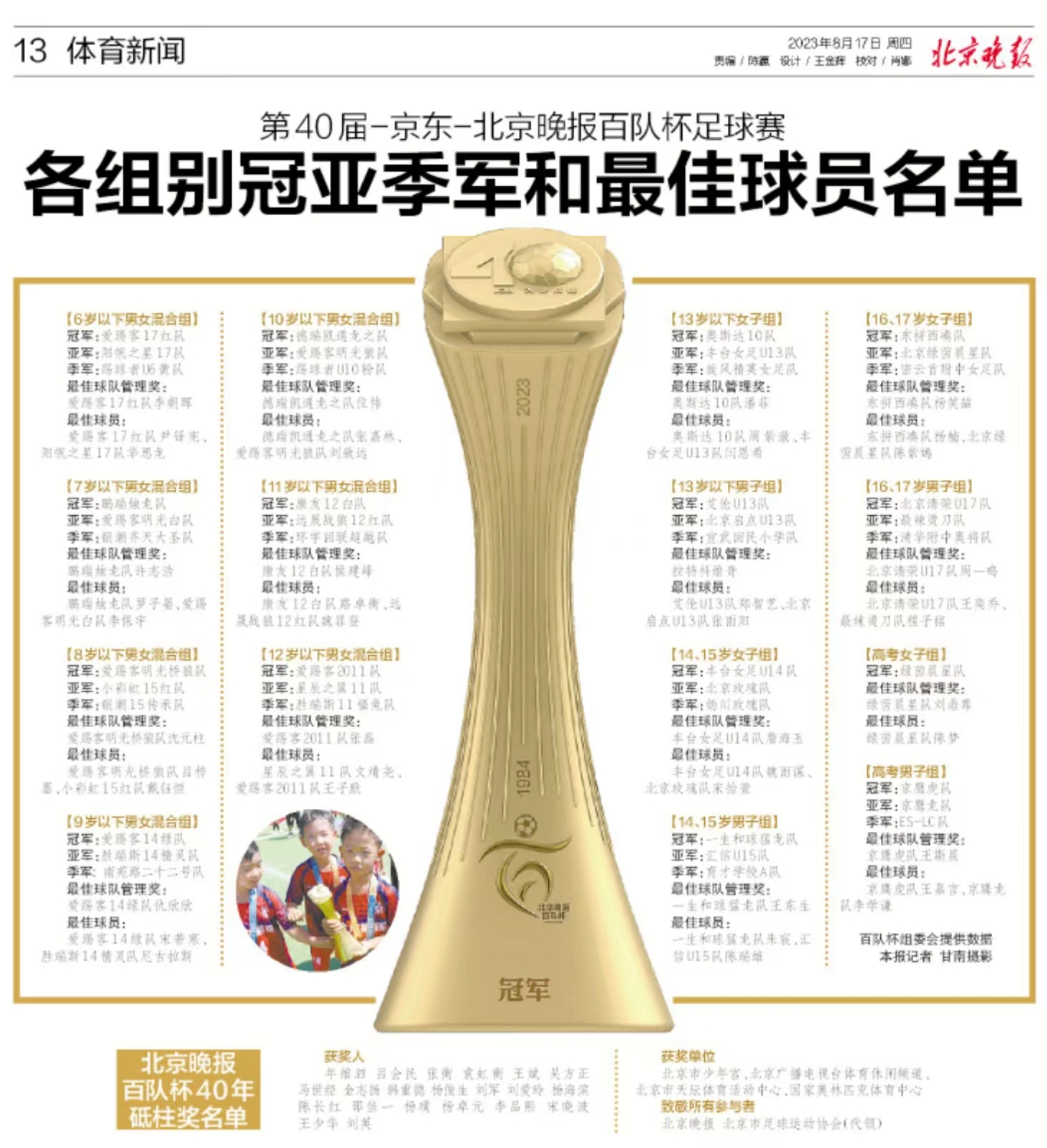 16日,第40届-京东-北京晚报百队杯足球赛圆满落幕,各个组别名次和各奖项已新鲜出炉。17日,获奖球队的名字和最佳球员的名字都出现在了《北京晚报》第13版上。纸质版的获奖名单可以永久收藏!这些获奖球队和最佳球员的名字真地是从此永载史册了,因为《北京晚报》在各大博物馆都有收藏,用于资料查阅。
